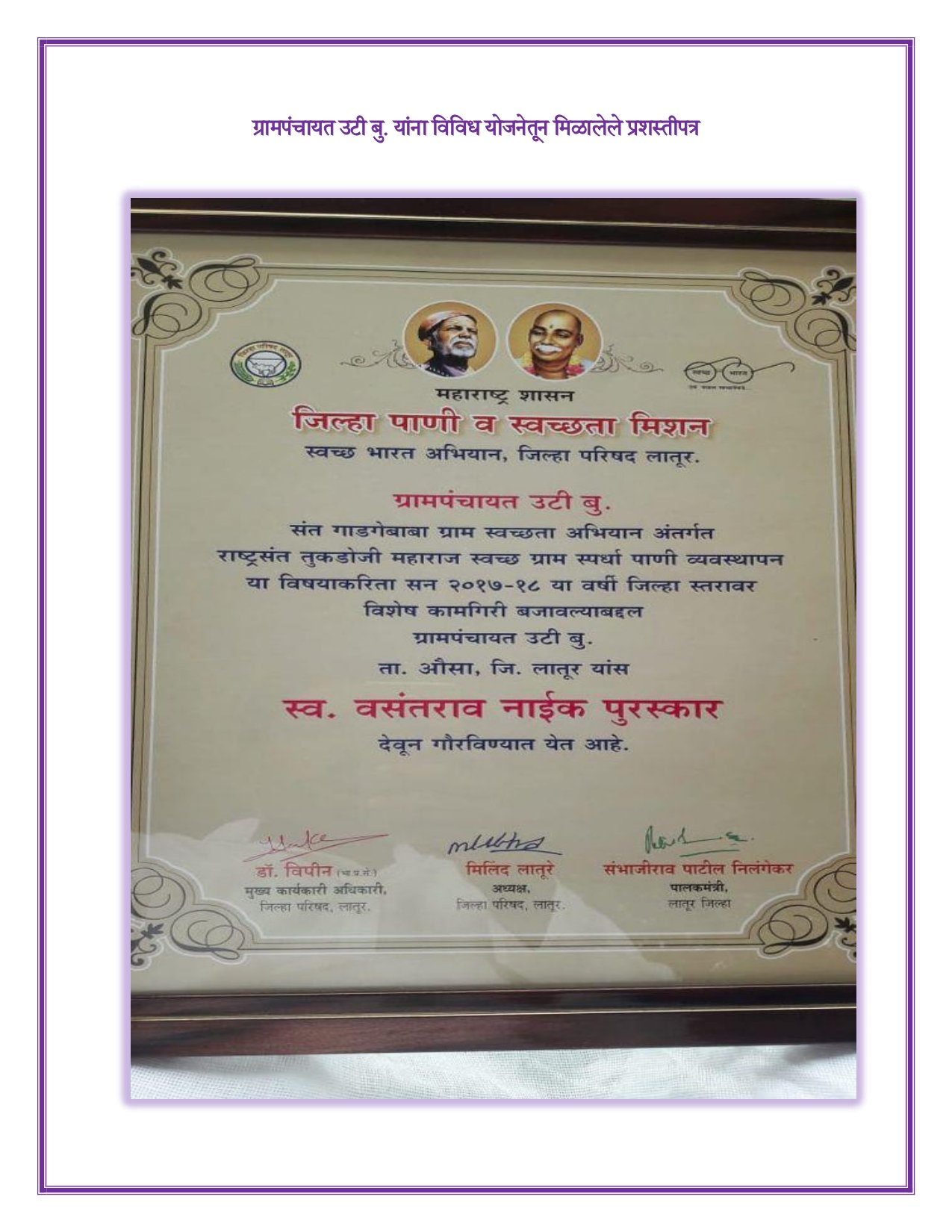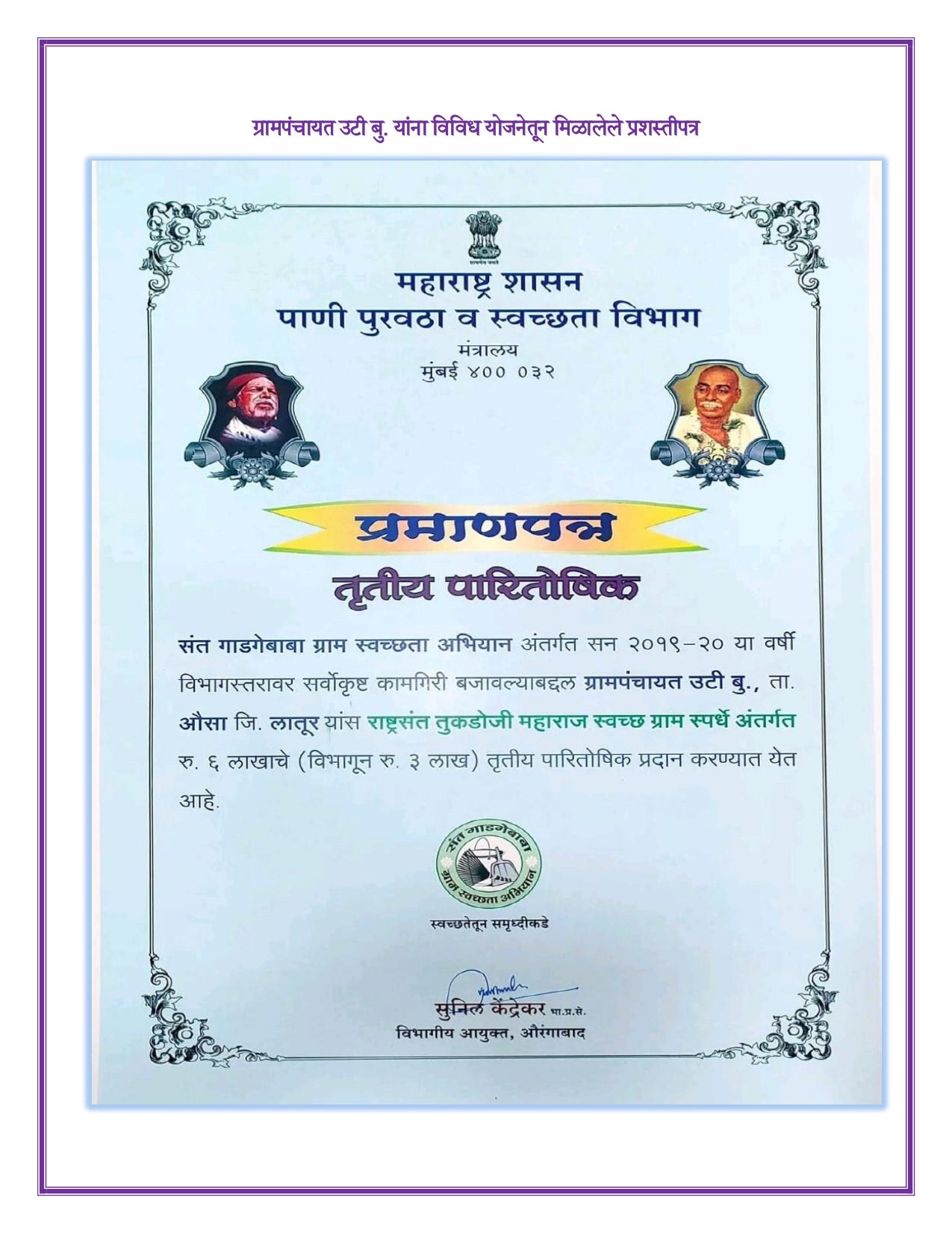 ग्रामपंचायत उटी (बु.) गावाने विविध सरकारी योजनांअंतर्गत उत्कृष्ट कामगिरीसाठी अनेक सन्मान चिन्हे आणि पुरस्कार मिळाले आहेत..