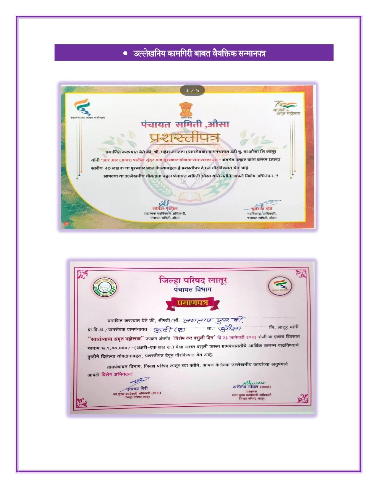 ग्रामपंचायतीने गेल्या काही वर्षांमध्ये विविध सामाजिक, शैक्षणिक व पर्यावरणीय उपक्रमांद्वारे अनेक महत्त्वाचे पुरस्कार प्राप्त केले आहेत. या पुरस्कारांमुळे गावाची ओळख एक प्रगतशील, सुशिक्षित आणि पर्यावरणपूरक गाव म्हणून झाली आहे